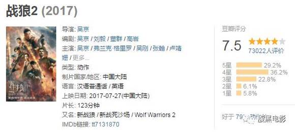 《战狼2》目前豆瓣评分7.5(73022人评价)。