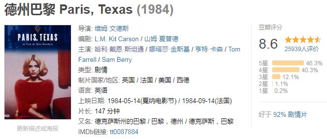 哈利·戴恩·斯坦通出演的最著名的一部电影就是与导演文德斯合作的「德州巴黎」。