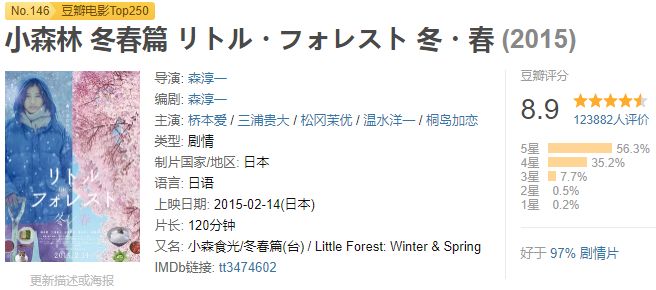 日版「小森林」已经经典到无法复制,在豆瓣上,「小森林夏秋」和「冬春」的评分分别都位列豆瓣电影top250里。