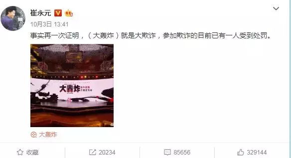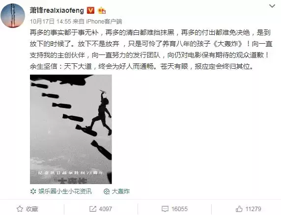 10月17日下午,「大轰炸」导演萧锋通过其新浪微博宣布: