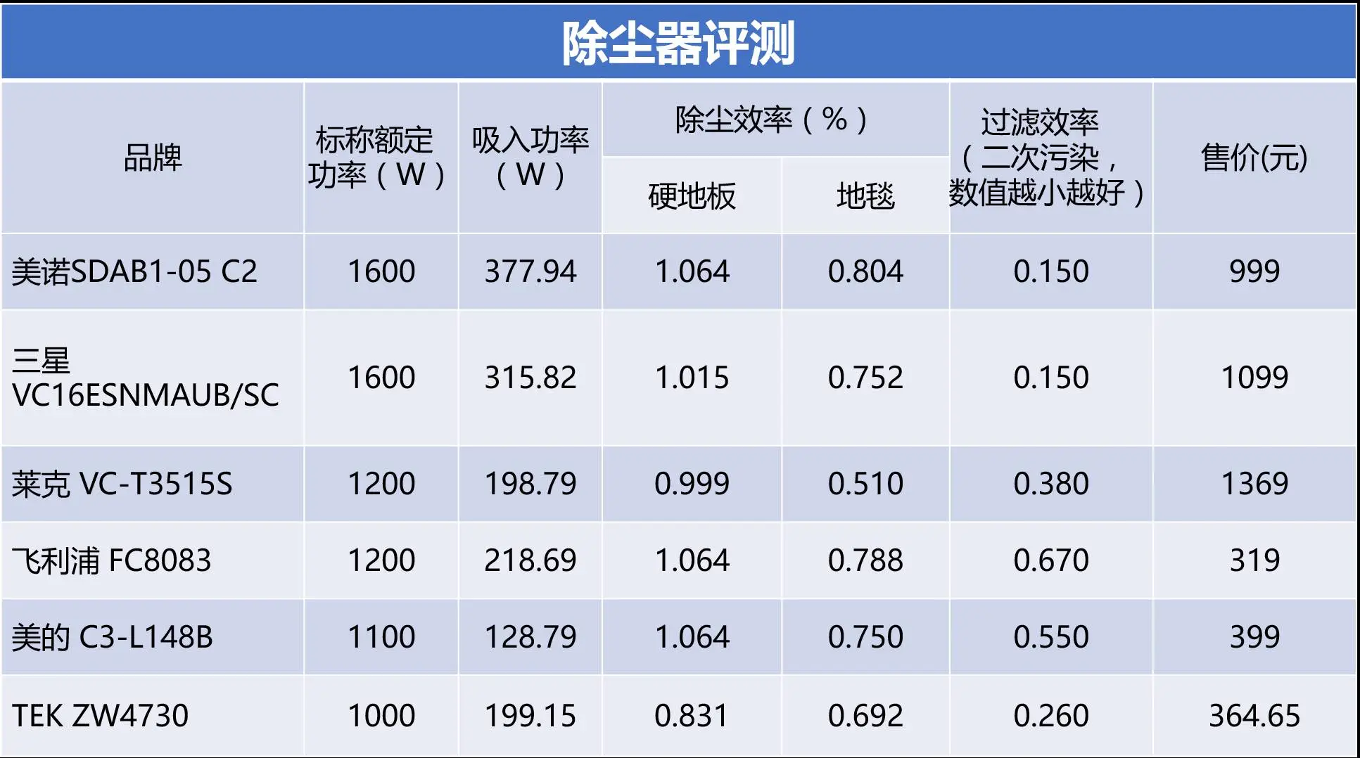 中消协不久前做了一个除尘器评测,主要评测了三个指标:吸入功率;除尘效率、过滤效率。