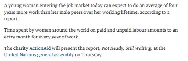 据美国国际行动援助组织发布的报告称,相比于男性,平均每位女性一生用在无偿劳动上的时间多了23年!