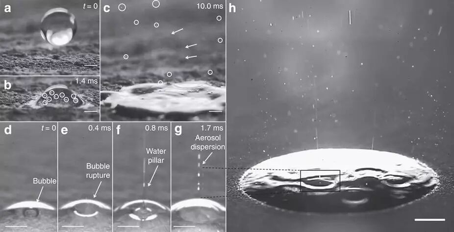 水滴撞击多孔表面形成气溶胶的过程。(a。雨滴以2m/s的速度撞击土壤表面;b。雨滴落下接触到地面时,会把地里的气体包裹住,产生各种小气泡;c。就像打开一瓶被摇过的雪碧,气体扑面而来的感觉,水滴撞击后喷射出细小的