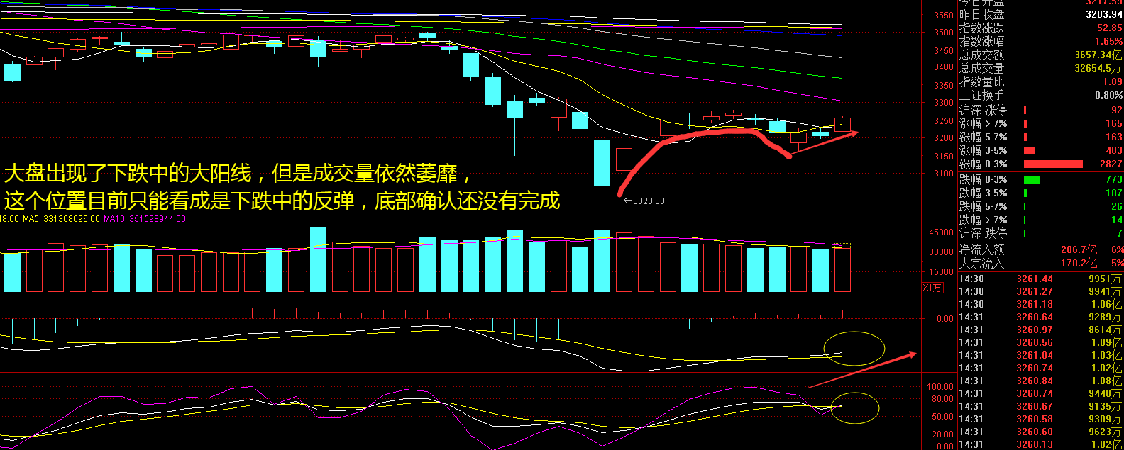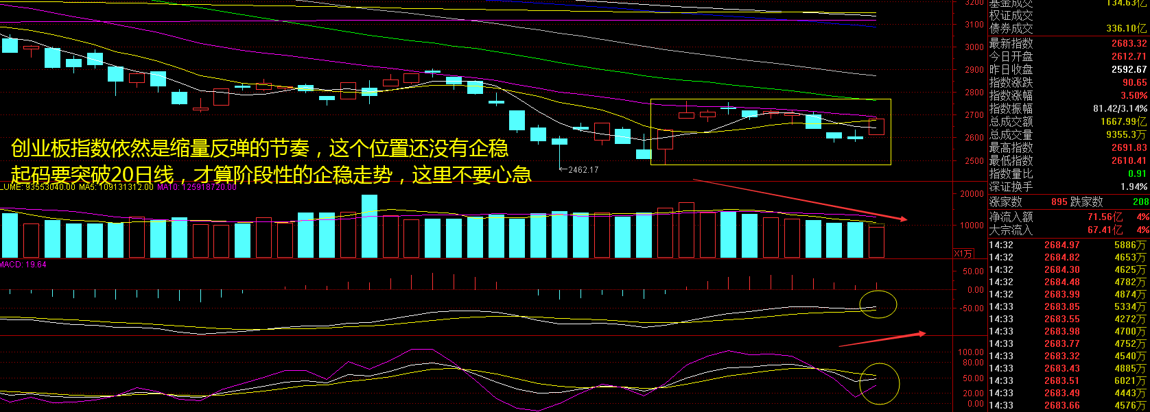 上证指数周三高开高走,盘中涨近2%,站上5日线和10日线后,始终未能突破20日线,金融股、房地产等权重股的助力,走出明显的止跌迹象,这个位置要是能上攻到3300点之上,那么趋势将会完全反转,目前依然是下跌中的反弹走势,接下来注意大盘能否在3270点之上稳住。