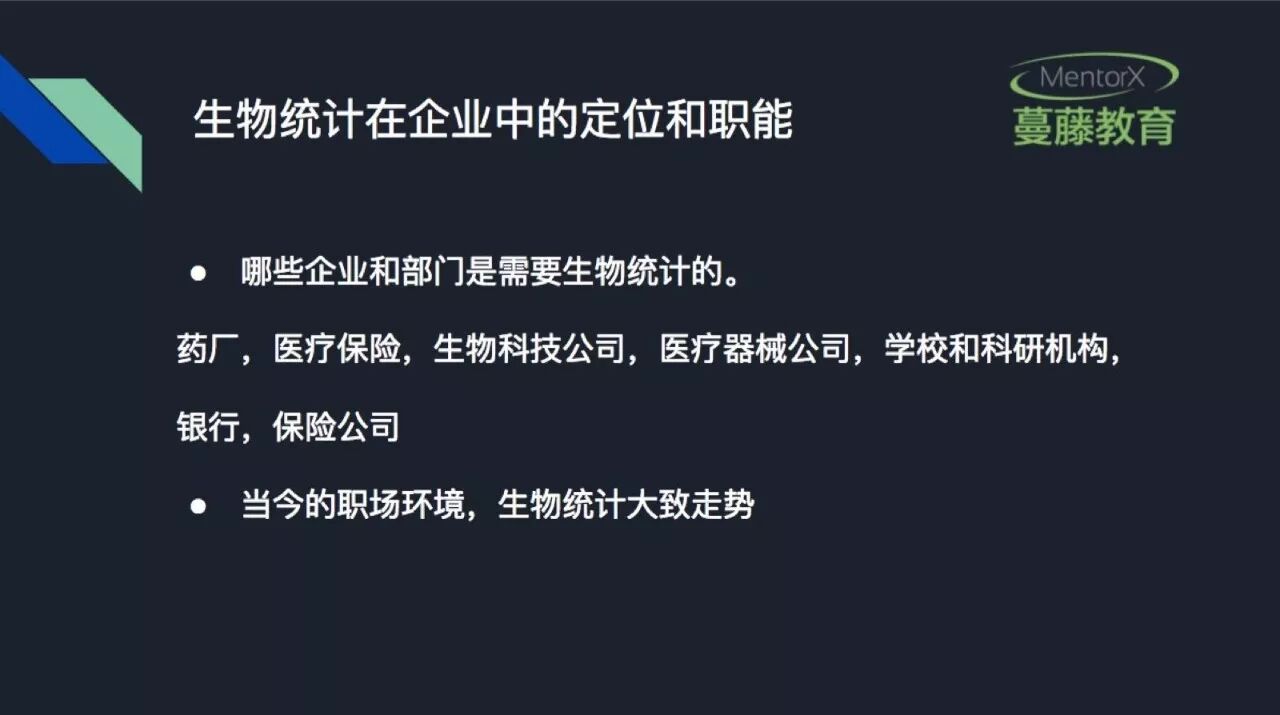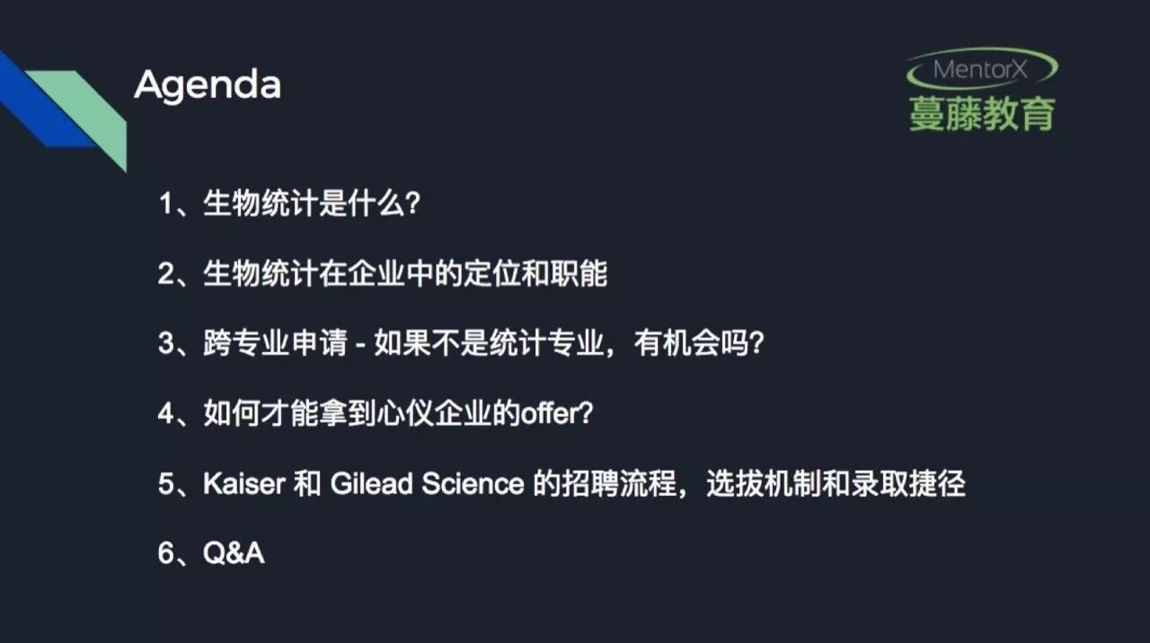 今天重点主要会和大家聊一下“生物统计是什么,生物统计在企业中的定位和智能,以及跨专业申请怎么办,以及知名企业的面试技巧及录取捷径等”。