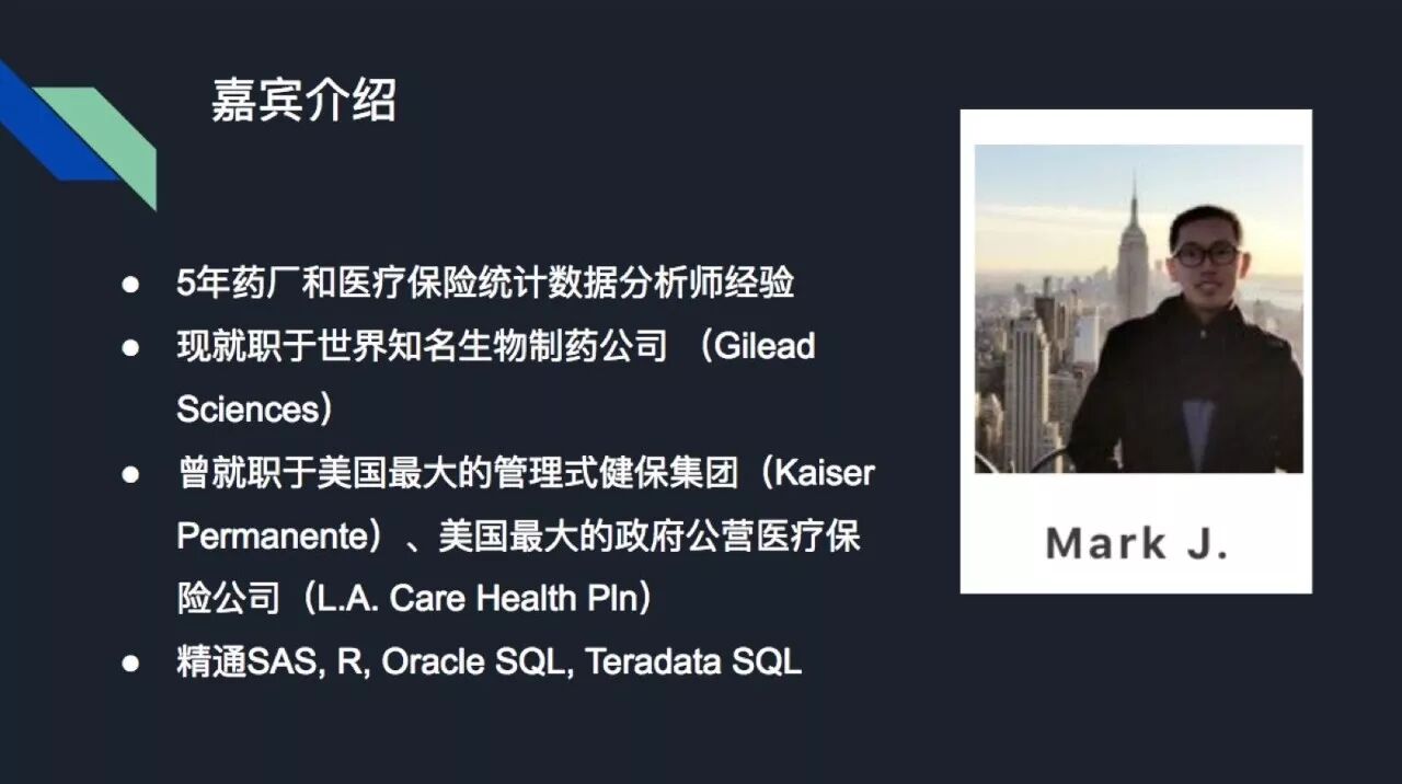 大家好!我是Mark老师,今天就由我为大家进行分享。本科学的是医学,毕业以后也在做生物统计相关的工作,曾就职于一些医疗保健公司和药厂。