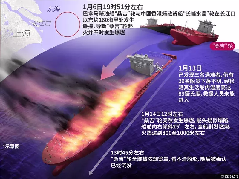 1月6日晚,巴拿马籍油船“桑吉”号与装载约6.4万吨谷物的中国香港籍散货船“长峰水晶”号,在上海辖区长江口以东约160海里处发生碰撞,导致“桑吉”号全船失火。据央视新闻消息,当时“桑吉”号上携带有100万桶(约13.6万吨)凝析油。