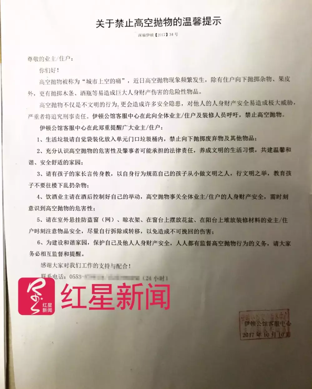1月18日,红星新闻在伊顿公馆28栋楼下发现一张“关于高空抛物的温馨提示”,上面写道:高空抛物被称为“城市上空的痛”。高空抛物不仅是不文明行为,更会造成很多安全隐患,对他人的人身财产安全易造成极大威胁,严重者将追究刑事责任。