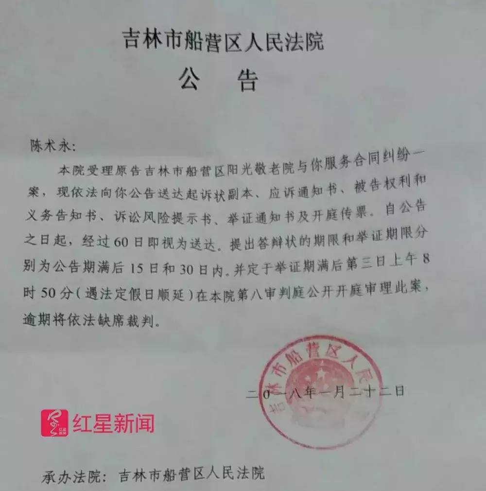 孙先生向红星新闻提供的一份吉林市船营区人民发布的公告显示,“陈术永,本院受理原告吉林市船营区阳光敬老院与你服务合同纠纷一案,现依法向你公告送到起诉状副本……逾期将依法缺席审判。”