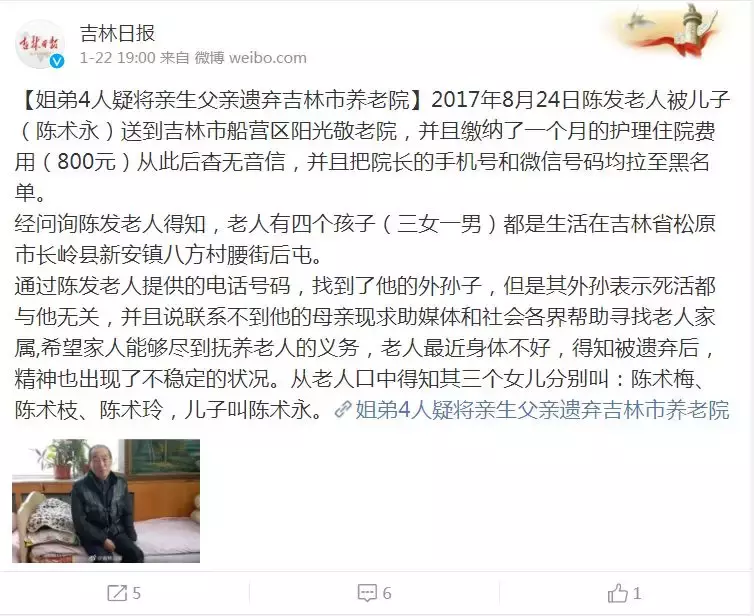 近日,有媒体报道“吉林姐弟4人疑将亲生父亲遗弃养老院”,引发关注。
