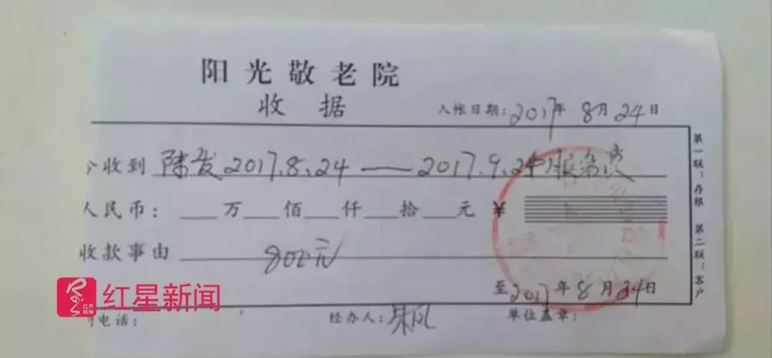 朱凤说,老人被送来时是脑血栓后遗症,属于半自理。考虑到陈家情况,(院方)就按800块钱一月进行收费。据院方提供的收据显示:
