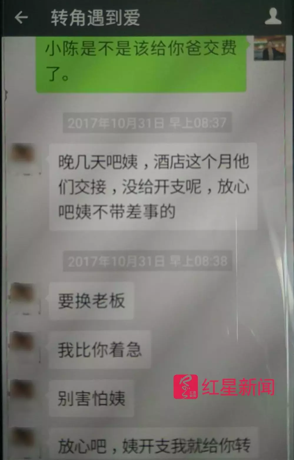 10月下旬,朱凤再次微信联系陈术永交费。10月31日8:37,陈术永回复了,其要求“晚几天”,因为酒店还没发工资,并向朱凤表示,“放心吧姨不带差事的”。