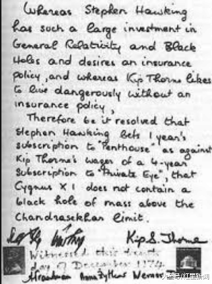 因此,二人当时便立下字据,霍金以一年的色情杂志《阁楼》(Penthouse)对赌索恩4年的杂志《私家侦探》(Private Eye)。