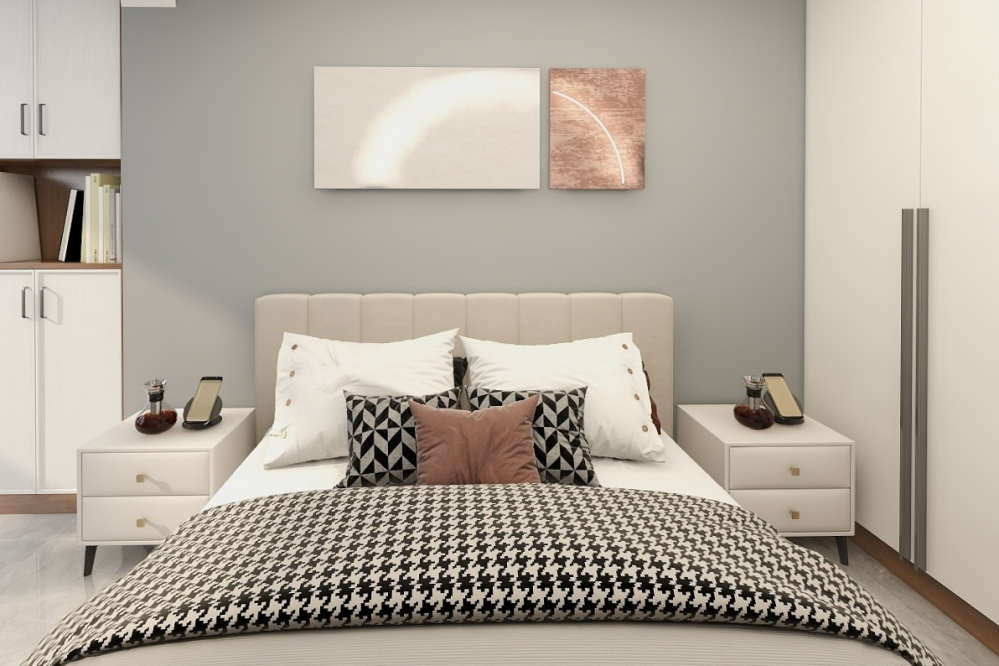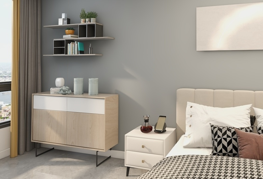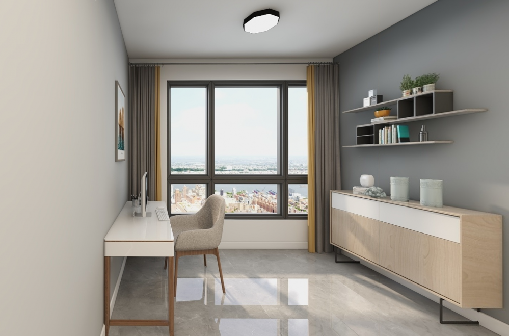 卧室的靠窗的一侧空间,摆放电脑桌和收纳柜,并在收纳柜上方打造隔板,可以用来摆放书籍和小绿植,成为卧室的一大亮点。