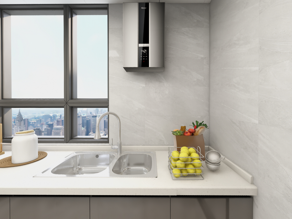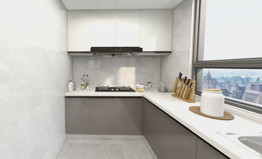 厨房墙面通铺灰色大理石纹路的瓷砖,搭配灰色的橱柜,利用不同饱和度的灰色,营造空间层次感。