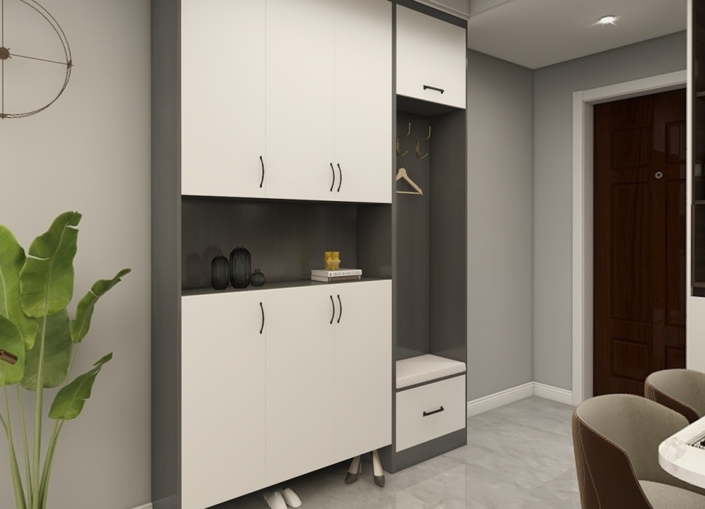 入门处定制白色多功能的组合柜,柜体下面悬空部分可以放置拖鞋,挂衣区可以放置出门的外套,既美观又实用。