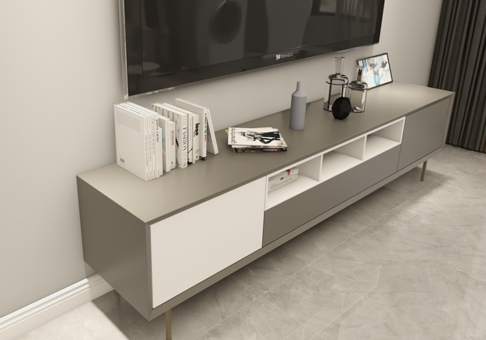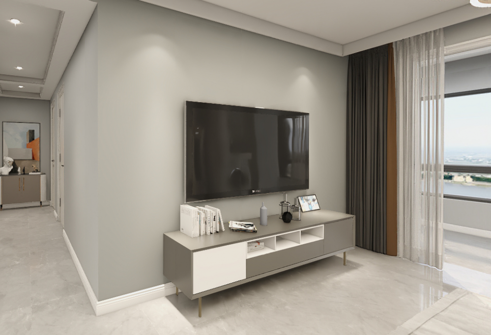 电视背景墙只是简单的涂刷了浅灰色的乳胶漆,没有任何其他多余的装饰,搭配同色线条分明的简约电视柜,成为了整个画面的焦点。