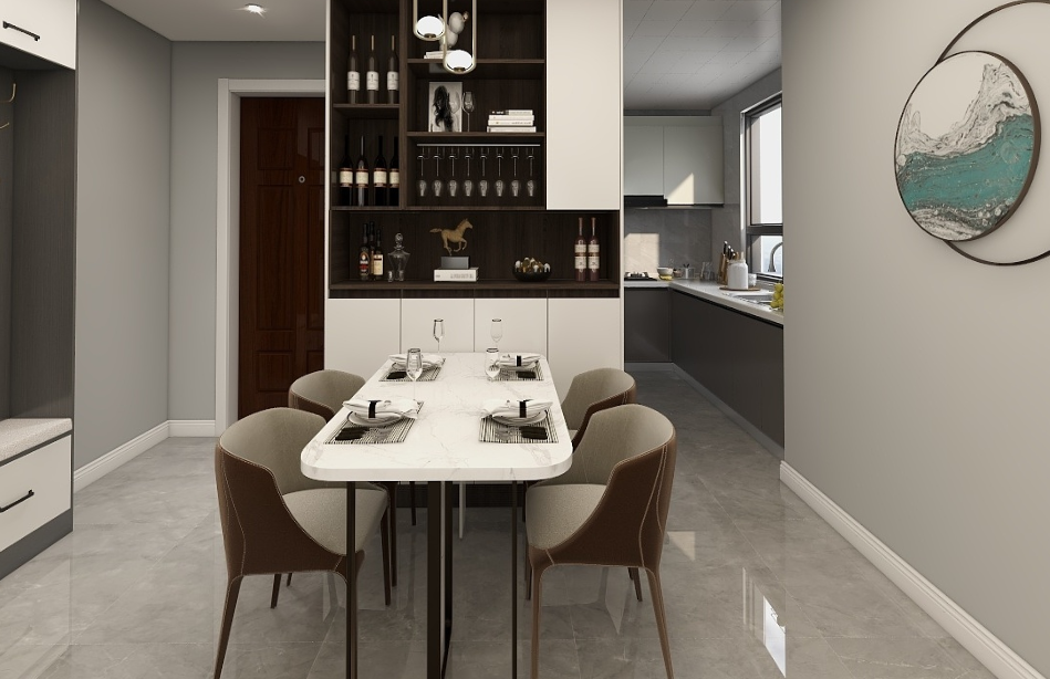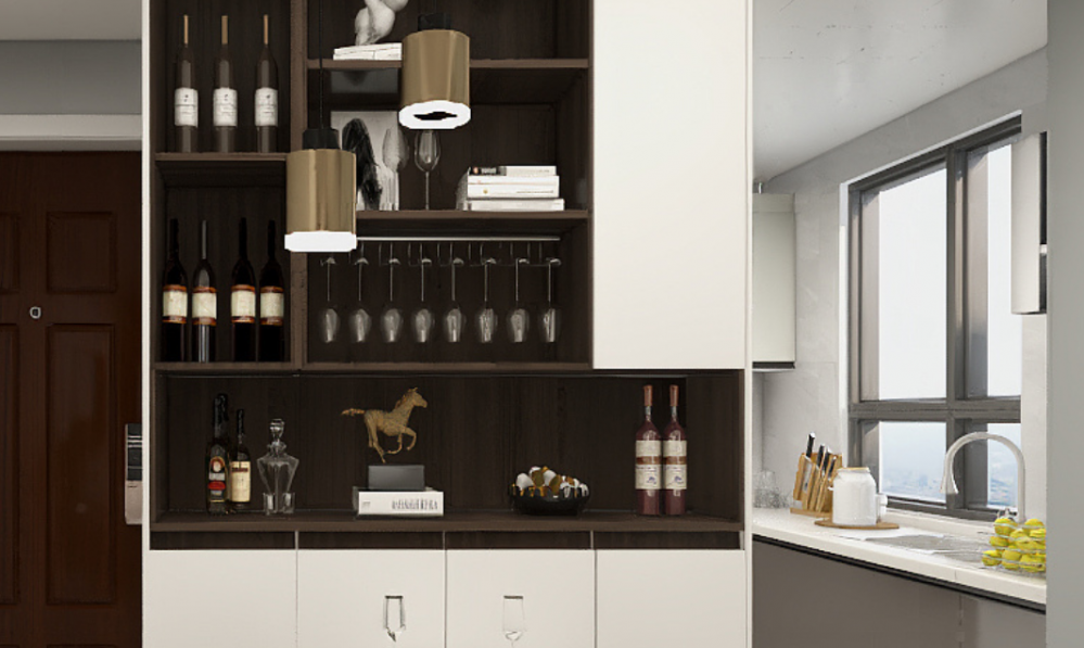 餐桌旁打造组合酒柜,上半部分开放式设计,用来摆放红酒,下半部分封闭设计,实现餐边柜的功能,提升家居品质的同时,提高收纳能力。