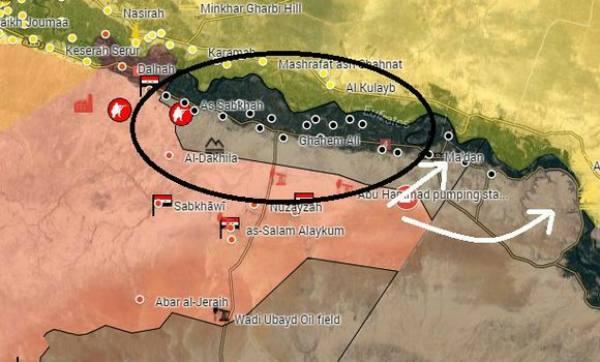 而就在昨天,叙军前锋突然不再紧贴河岸进攻,而是绕开与河岸相邻、目前仍被IS控制的城镇,在南部平行向东切割,直接打到了代尔祖尔省边界,显然他们这样的战术是避实就虚,直奔更为重要的代尔祖尔。