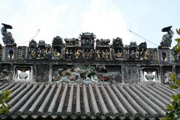 用石灰工艺在建筑物上雕塑造型,余荫山房灰塑,表现形式有多层式“立体”灰塑,浮雕式“半沉浮”灰塑,也有图雕式单个造型“单体”灰塑等,灰塑的工艺特点,工艺精细,色彩艳丽,璀璨生辉。