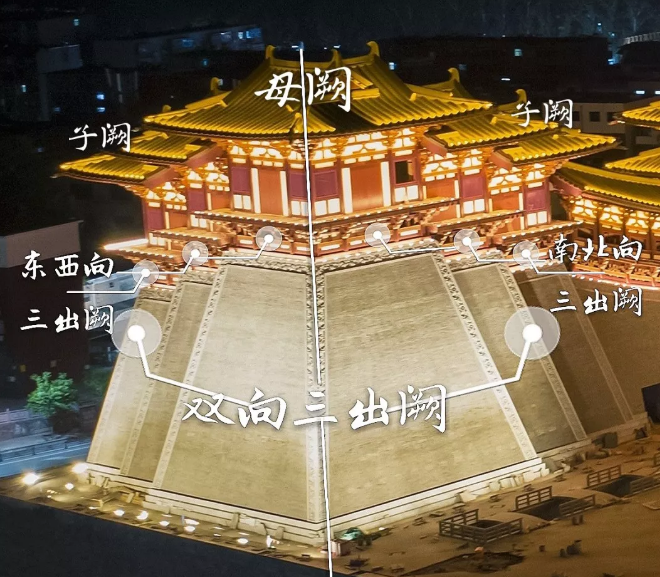 阙楼是城门前两边的望楼,有单阙、二出阙、三出阙之分。三出阙等级最高,一般是在母阙外延(或后方)附有两出子阙,规模依次缩小。阙制中最高等级的三出阙一般耸立在帝王居住的宫廷大门前面,是天下独尊的标志性建筑。应天门双向三出阙,结构更复杂,是古代城门建制的最高等级,在中国都城建筑史上占有重要地位。