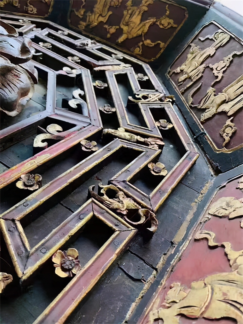 藻井的工艺非常复杂,是工匠们不用钉子,利用榫卯、斗拱堆叠而成的。各种梁檩穿插结构形成藻井,被认为是中华木造建筑一项繁什的装饰技术。