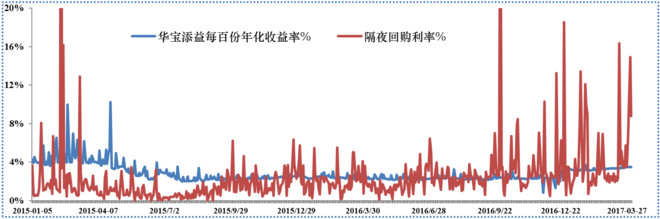 其一,相对于隔夜逆回购的操作,华宝添益操作更加方便,收益率更高。由于隔夜逆回购需要每天下达一次交易指令,才能获得持续利息收入,对网络的依赖程度高。而华宝添益只需买入并持有,无需再频繁操作即可无缝对接证券和货币基金,享受两边的收益。根据Wind数据显示,截至2017年3月31日,自华宝添益2015年以来的547个交易日中,有388个交易日,其每百份年化收益率高于隔夜回购利率(收盘价),优势天数占比约71.00%。