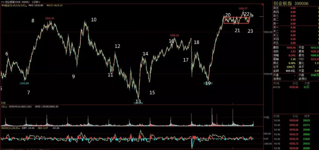 今天创业板的震荡也维持强势,在上方构筑了19点以来的1F级别中枢,这个离开5F中枢的1F走势目前还比较健康,只要不出现20-23这中枢的三卖问题就不大。