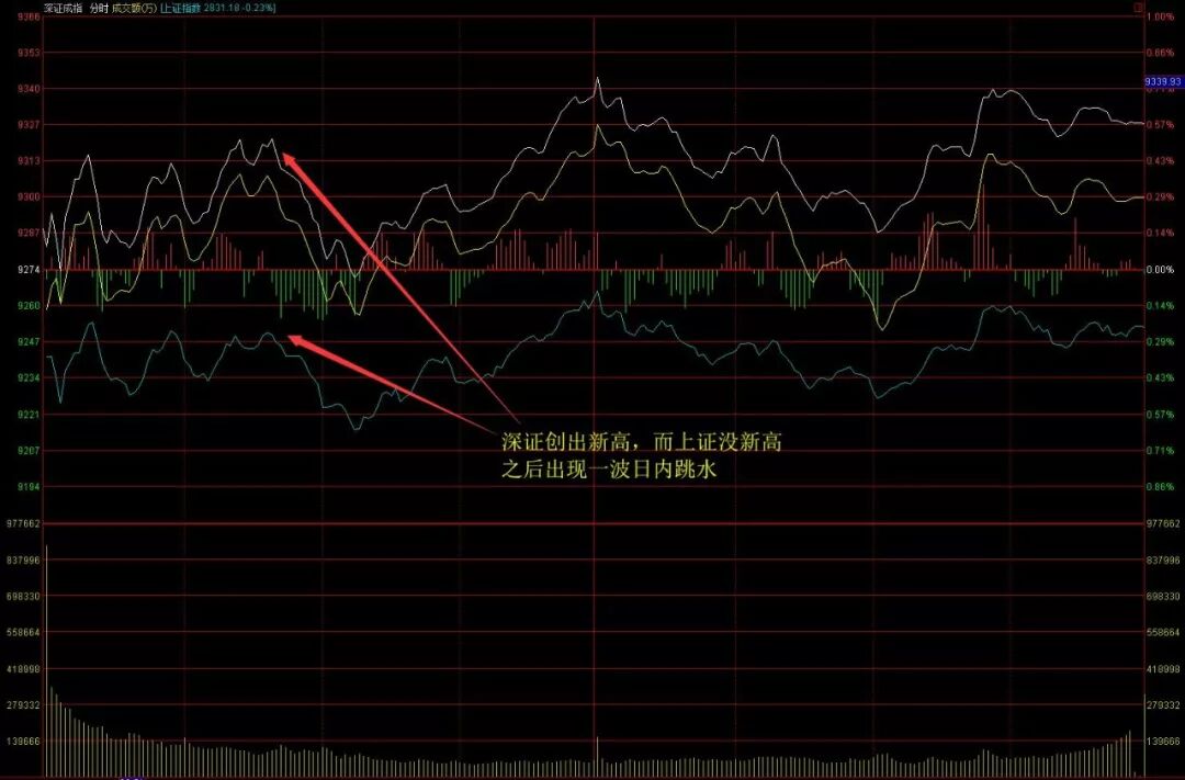可以看到,当天午盘时,上证指数新高,而深证指数却不再新高,之后出现一波日内跳水。