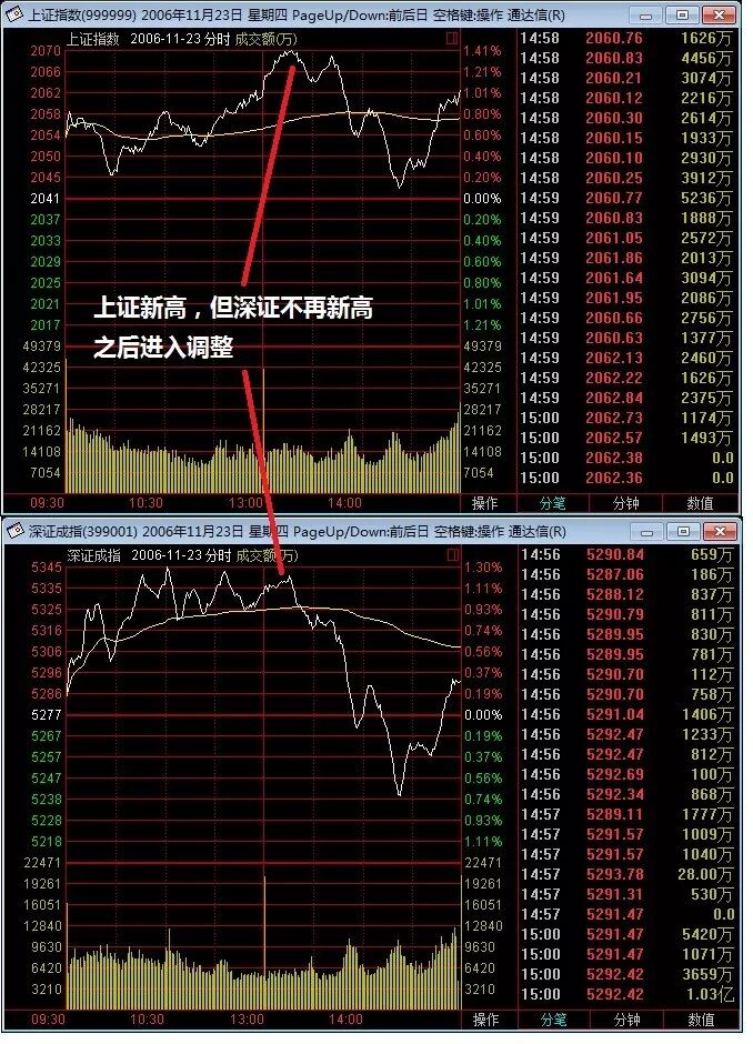 例如,在2006年11月23日,当天沪深两个指数如下图: