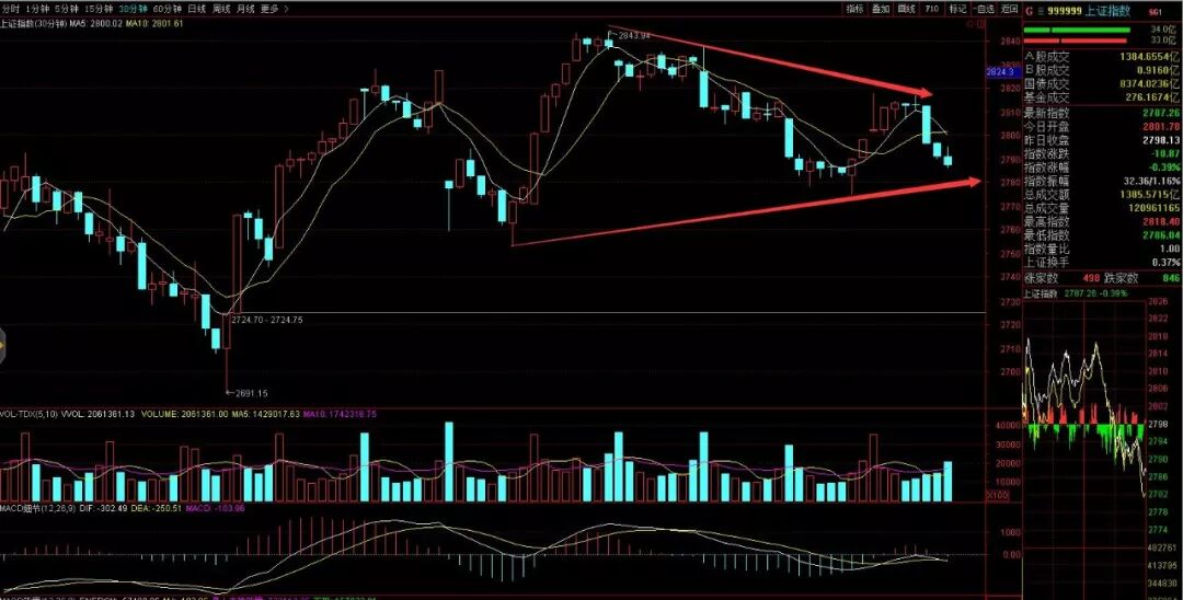 现在的中枢震荡从奔走型走成了收敛三角型,这也说明了市场合力从强到平衡,因此,明天就看这三角型的突破方向,一旦向下突破,也就确立了这跌破10日均线的有效性。