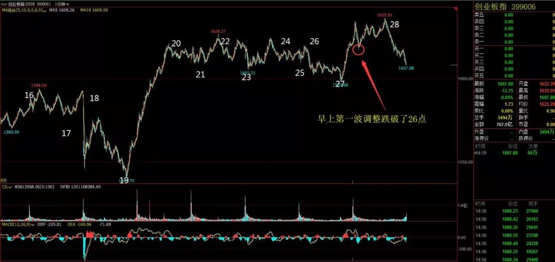 昨天解盘《创业板三买,主板请不要拖后腿》中,提到今天创业板要关注的地方是昨天尾盘的上涨以及今天的上涨与5分钟图中5-6那段走势的力度对比,并且提到今天回调的第一段,不跌破1分钟图中的26点才是1F三买。遗憾的是,今天的走势力度也比5-6弱,早盘的第一个下跌就跌破了26点。