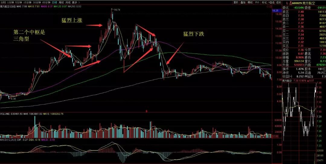 2. 南方航空, 2015年5月的那个中枢,后来也呈现收敛形态,后面的突破猛烈上涨。 在股灾1.0和2.0之间的盘整也是一个收敛三角型,股灾2.0突破该三角型,最终与1.0那段比较有背驰。