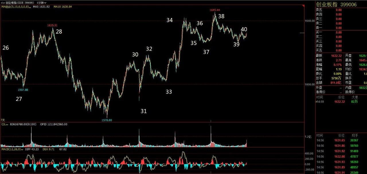 创业板,38点的趋势背驰比较明显,于是,29-38是一个标准的上涨趋势。那么在5F级别上的分解,就要稍作调整了,也就是昨天图中的10,11的位置要变动一下,放在这1F趋势的终点,如下图: