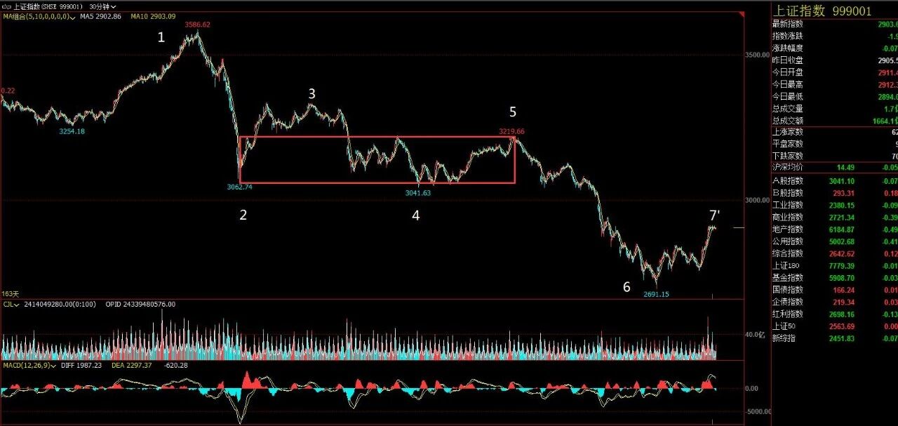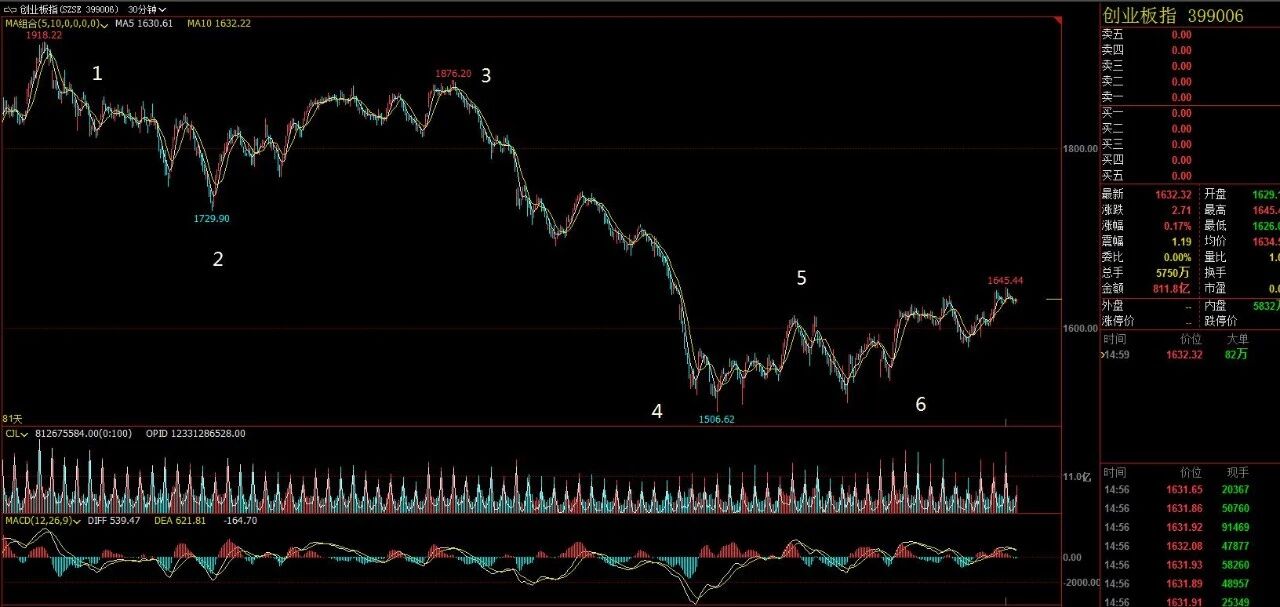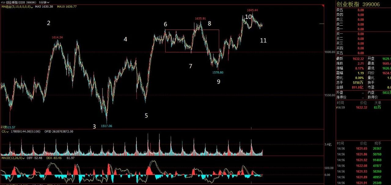 今天11点的位置直接跌破了6点,所以也没有三买的可能了。目前,创业板指数这波反弹的中枢级别扩大了,从1到10,共有9个1F级别的走势,数量上已经可以形成30F级别的中枢,因此,在30F级别图里,相应的走势也要做一下调整