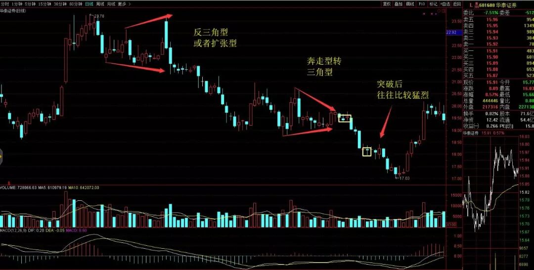 3. 华泰证券, 2017年11月,这日线下跌的第二个中枢,是从奔走型转向收敛三角型的,其后的突破往往比较猛烈