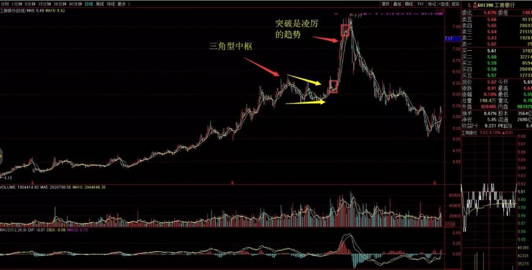 1. 工商银行,去年10月开始的那个周线中枢,明显的三角型,后面的突破非常猛烈,但跌得也快