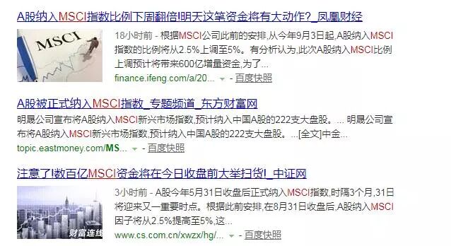 这两天大家一定看到有关MSCI增仓的新闻,百度搜一下“MSCI指数”,新闻标题一般都是这样的: