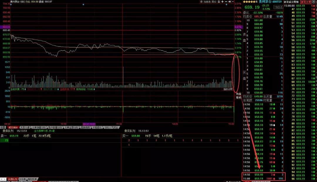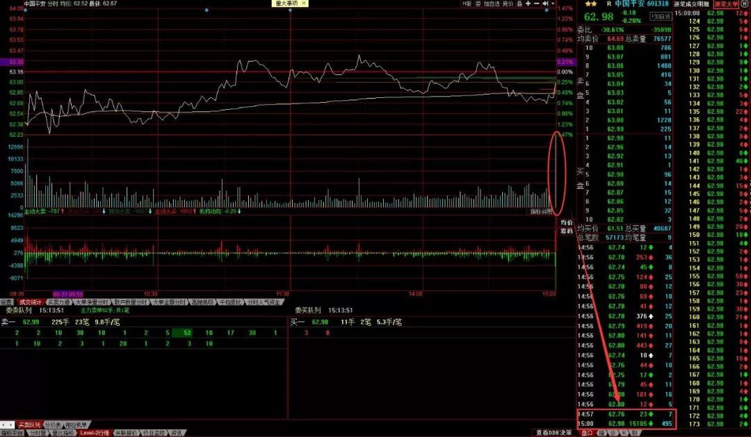 看到了吧,只有尾盘集合竞价时,抬高了一些价位,放了一些量有所成交。再看看权重比较大的平安、茅台