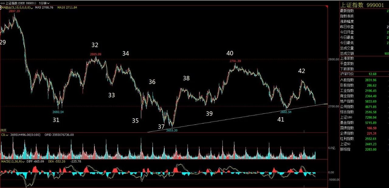前面剧本提到当下的关键位置就是2700点,因为这是5F中枢的ZD位置,最差的是跌破2692,这是DD,而且如果跌破DD,那么从2791点下来的走势分解则变成了三个1F走势,那么周末的那个投票也就分出结果了。