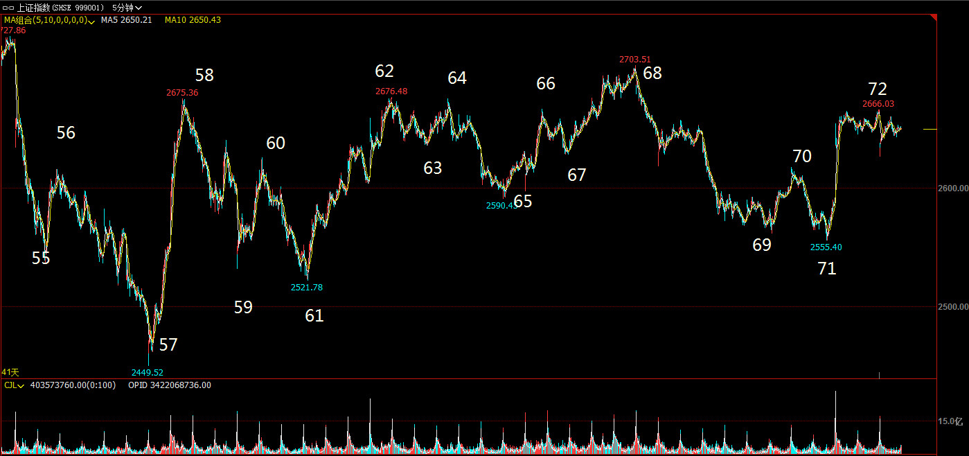 昨天解盘也提到,这里最好震荡出5F中枢,今天的节奏就是朝着这个剧本在走。在5F上,71点起来的走势是构筑右肩,行情要想继续向上走,那么这71点起来的5F走势就不能止步于此,因此,在这2676点附近如果有5F中枢的三买,才是最后的冲锋号角!