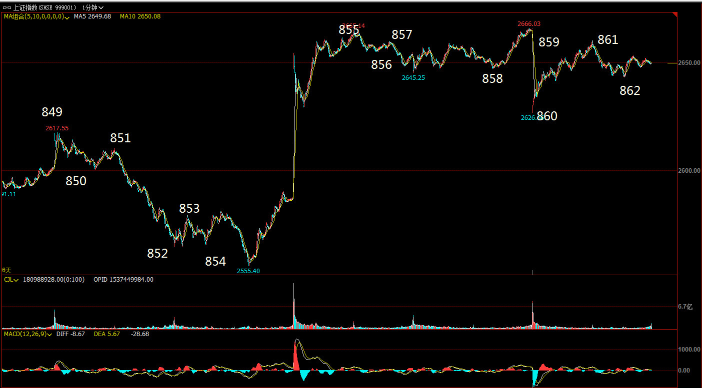 1F上,今天的低开由于跌破了昨天的1F中枢,因此有点类似当年的530,这个缺口是可以看做一段,也就是图中的859-860
