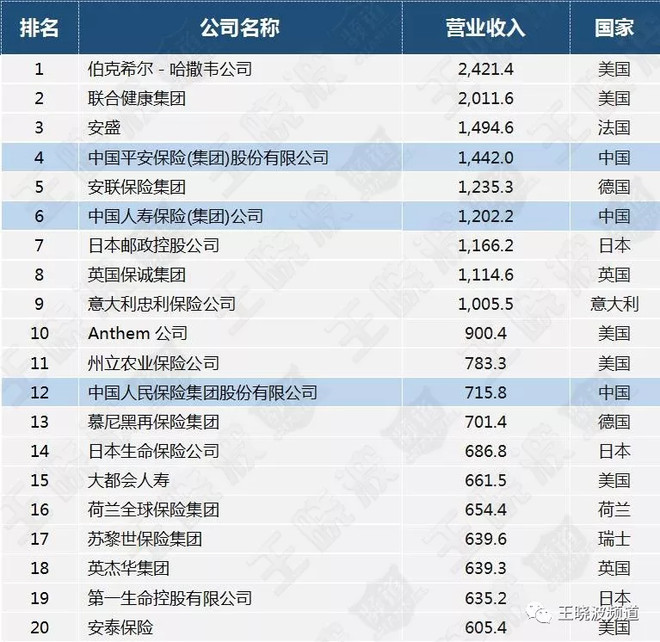 2018年7月19日,最新的《财富》世界500强排行榜发布,该榜单基于2017年度营业收入进行排名,上榜的保险公司共有58家,分布在12个国家,其中美国21家,中国9家,日本8家,英国、德国和瑞士均为3家,法国、加拿大、荷兰、意大利和韩国各2家,西班牙1家。美国的伯克希尔·哈撒韦公司和联合健康集团位列前两名,营业收入均在2,000亿美元以上,法国安盛集团排名第三,进入前20名的中国公司有平安集团、国寿集团和人保集团,详见表1。