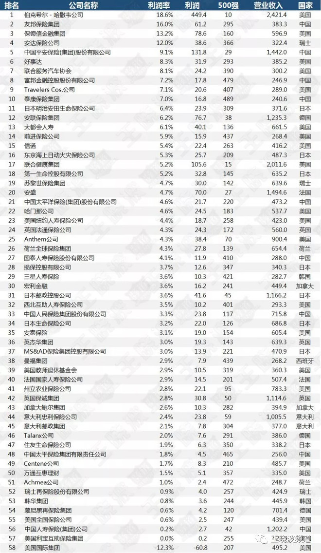 恐怕有的朋友很好奇,在财富500强保险公司中,谁的赚钱能力最弱?根据榜单,按2017年财务数据,美国国际集团(听着很耳熟?对啦,就是投资风险没有管好以至于在2008年金融危机时差点倒闭的那个AIG,中国友邦集团的前股东)营业收入495.2亿美元,净亏损60.8亿美元,以-12.3%的净利率垫底。