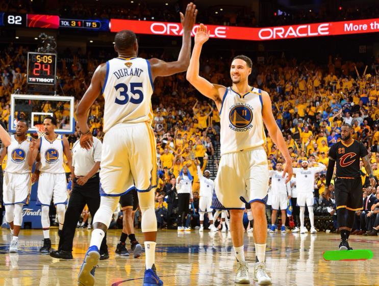 图中杜兰特和汤普森的击掌表现出团结和相互帮助