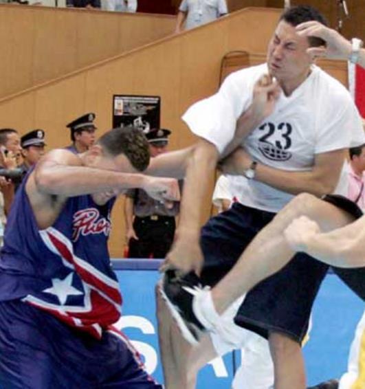 中国的三座移动长城之一,巴特尔跟姚明和王治郅不同,作为蒙古汉子,巴特尔的打架天赋可能是与生俱来的。曾经在NBA单手撂倒奥尼尔的男人,在中国男篮国家队,01年跟黎巴嫩的群殴当中,巴特尔对对手1米91的后卫一顿猛踹,直接踹到广告牌那边。