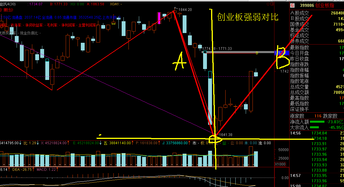 如果以7月18日1641点为时间和空间的中轴点,画一个坐标,创业板从7月7日1844点9个交易日跌至1641点,从7月18日算起今天正好是反弹第9天,如果从目前来定义,时间都是9个交易日,但是反弹段B相对于下跌段A是一个弱反弹,反弹的力度、速度、强度都比较弱,即使创业板持续反弹至1844点,但是B段的反弹也是弱的,因为用了更长的时间,消耗了更多的量能。