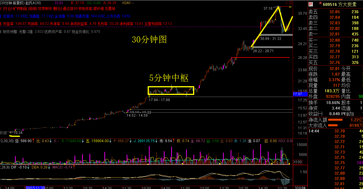 方大炭素是这波石墨烯、碳纤维龙头,从10元2两个与涨至37元,中途只形成过一个5分钟级别中枢,至今没有出现过30分钟缠论3卖,虽然上周五从盘中涨8.78%到收盘跌7%,也没有出现30分钟缠论3卖,目前一个30分钟级别的中枢都没有,不可能出现30分钟级别缠论3卖,37.18元附近是缠论1卖,可以减仓,反弹不创新高出现缠论2卖,也可以减仓,但是不出现缠论3卖就不要清仓。这个底仓可以让你从头吃到尾巴,这是技术,别抱着满仓从头吃到尾巴,这就属于贪婪了。