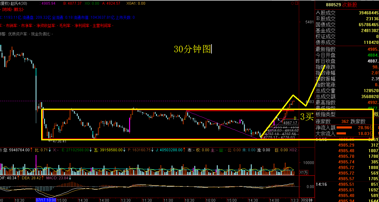 次新股30分钟级别终于来了一次突破,最后一个中枢是4740-4925点,虽然是完成了突破,但是如果回踩跌入4925点以下,没有形成3买,则会继续中枢盘整,这个中枢可能会变成一个下跌中继。次新股自2017年3月23日7616以来,第一波横盘一段,然后接着跌,然后横盘,然后继续跌,因此不要太乐观,出现回踩类买点确认以后再进入也是不迟的。