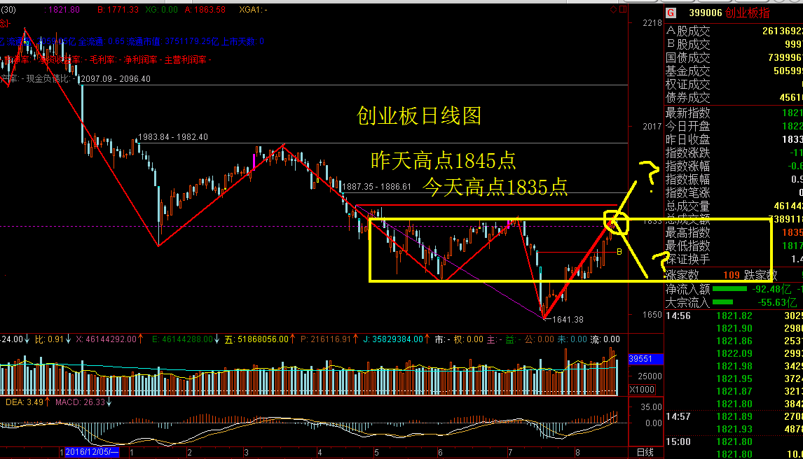 创业板今天没有继续创新高,昨天高点1845,今天高点1835,但是价格仍然在5日均线之上,日线上看不出调整。但是这里是中枢上沿,又是半年线附近,震荡的概率大,如果在7月19日抄底创业板的,这个位置是减仓的地方,如果没有,建议继续持币观望。